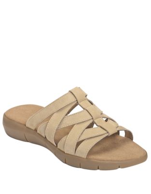 This velvety soft nubuck sandal whisks you away to the land of comfort. It s a slide with a scored 1? wedge for added flexibility, and a gathering of crisscross straps that look trendy and feel supportive. The very best cushioned insole goes with your busy life and keeps you comfortable while on the move. Sizes 5M-11M,12M. Click on Alternate View to see additional details. This is a Special Order item shipped directly from the manufacturer and may take up to 7 days for delivery.