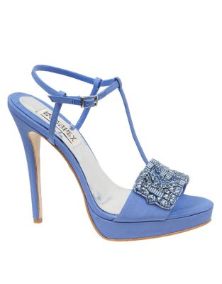 Make a stunning statement in these Amara T-strap dress sandals from Badgley Mischka. Features beaded detailing at the vamp; a T-strap; side adjustable buckle closure and a covered heel. Fits true to size